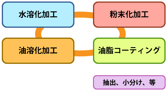 水溶化、油溶化、粉末化、コーティング等の素材機能化技術で、お客様のご要望に合わせた素材の受託加工を承っております。