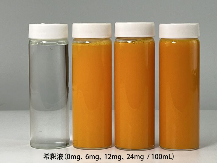β-カロテンは水に溶けない性質のため、飲料・ゼリーへの配合は難しいですが、β-カロテン乳剤3%は独自技術により水に溶けるよう加工しており、飲料・ゼリーに配合可能です。